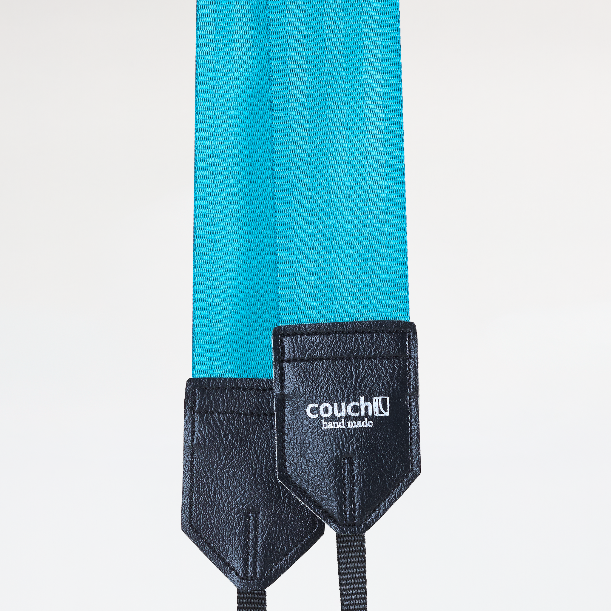 Couch camera strap crafted from repurposed seatbelt webbing and finished with vegan leather ends and adjustable universal hardware. Made in the USA.