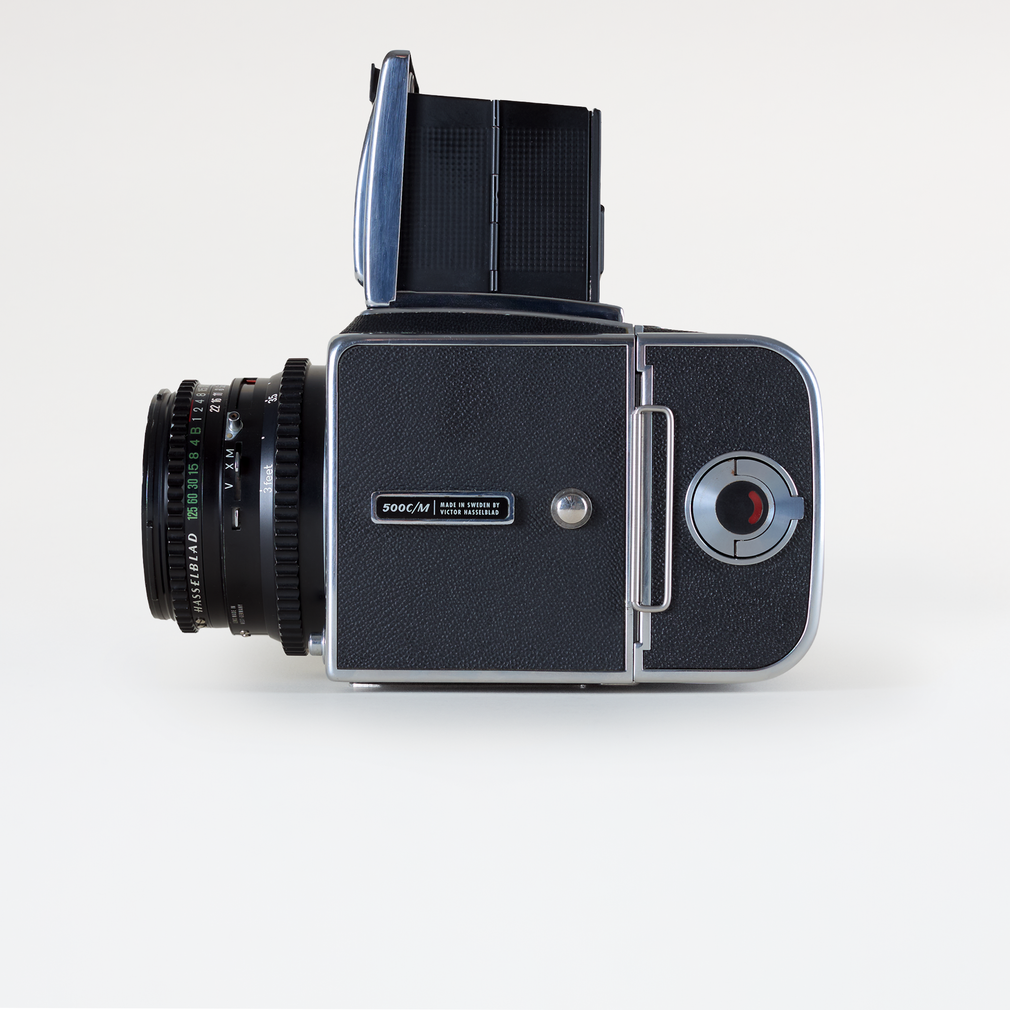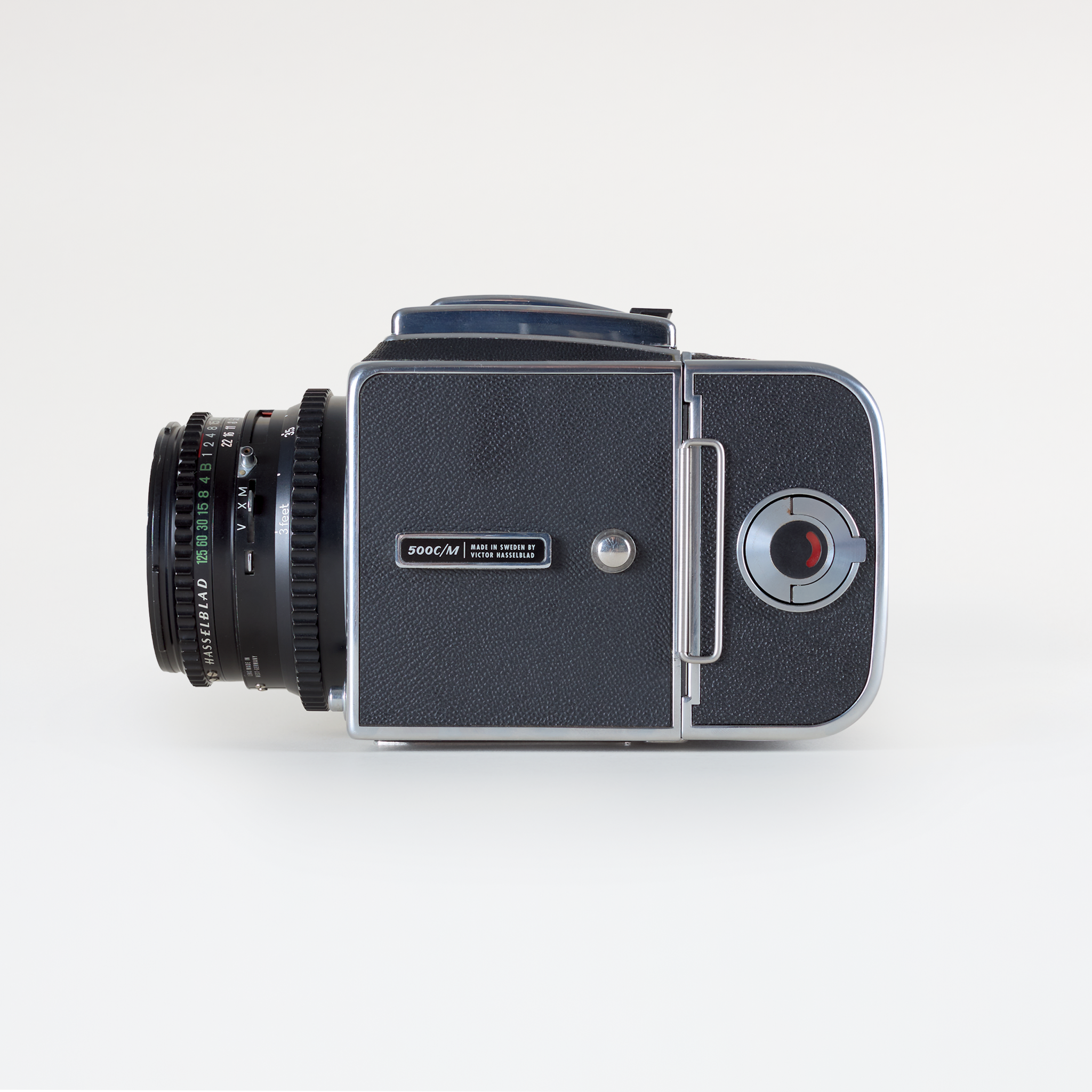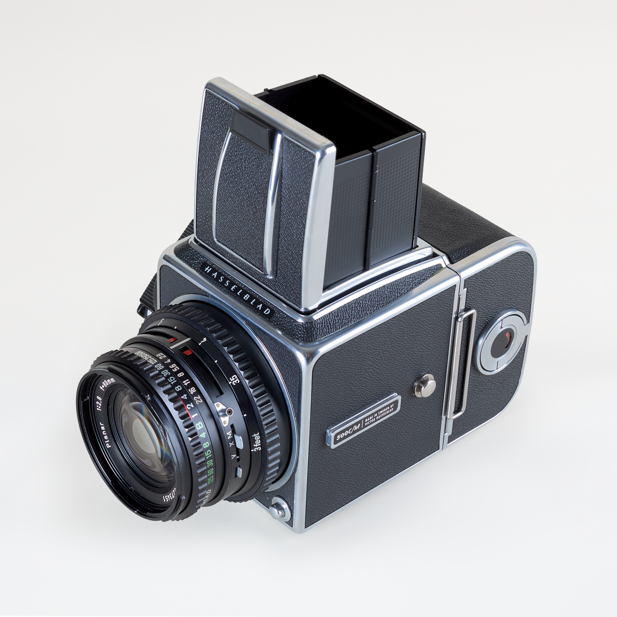 Built in Sweden, the 500 CM features a leaf-shutter lens system, interchangeable film backs, and bright waist-level finder